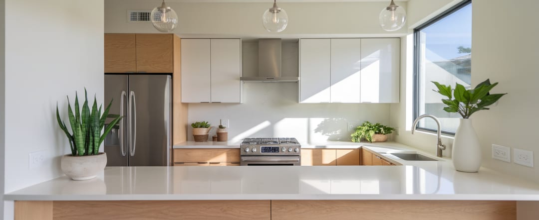 Transforming a compact kitchen in San Diego with sleek, eco-friendly quartz countertops, tailored to client's aesthetic preferences and functional needs.